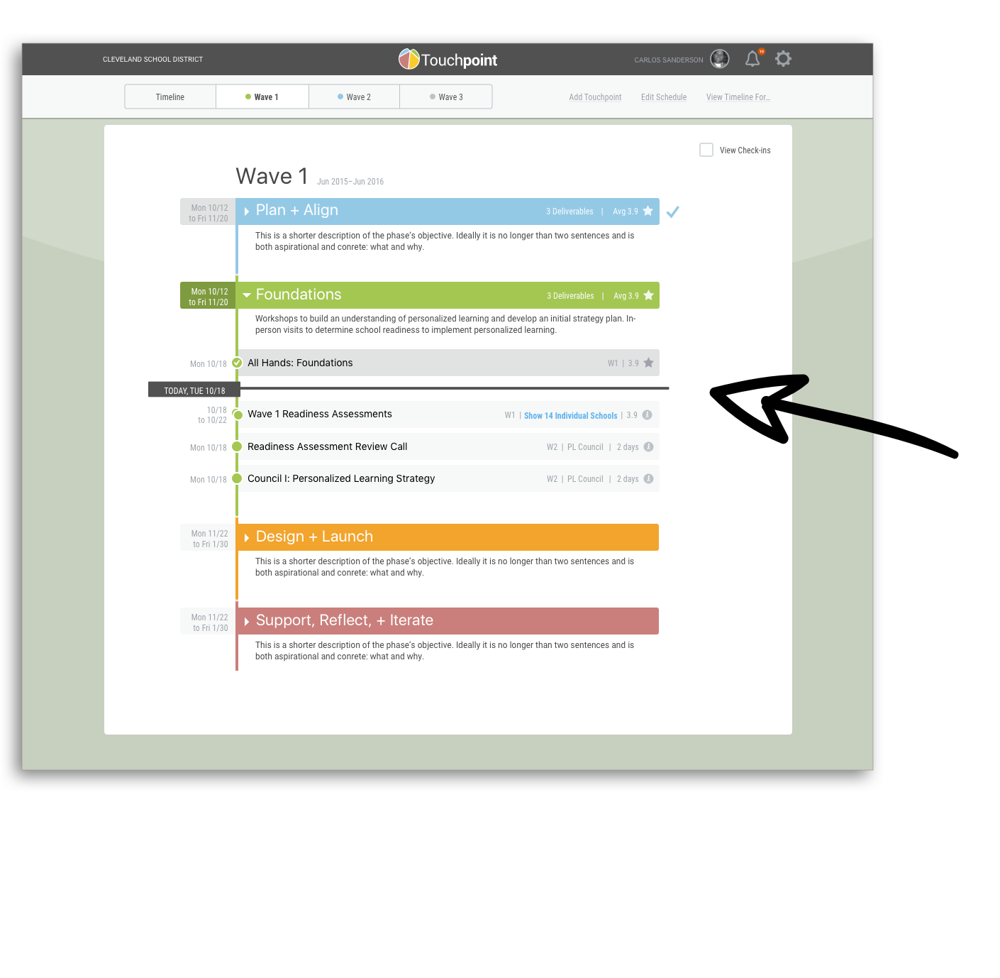 In the Timeline, there was a clear indication of where 'Today' was. The current phase was expanded to show all touch points. Previous and Future phases only showed high level summaries.